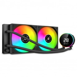 Está equipado con dos ventiladores ARGB de 120 mm con núcleo hiper balanceado de cobre, ofreciendo una disipación de calor superior y un funcionamiento silencioso, tubos de teflón extra largos, compatibilidad universal multi socket y pantalla LCD en la bomba de líquido para monitorear la temperatura refrigerante en tiempo real.