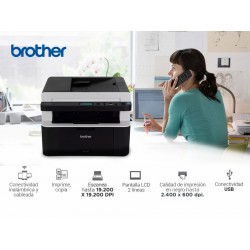 Multifuncional láser monocromático confiable y de precio económico, ideal para el hogar. Es compacto e imprime y copia hasta 21 ppm con rapidez. Es fácil de usar en red Ethernet o inalámbrica y permite imprimir desde dispositivos móviles vía Brother iPrint&Scan. Tiene un alimentador automático de documentos para copiar y escanear hasta 10 páginas, una bandeja expandible para 150 hojas hasta tamaño legal y utiliza cartuchos de tóner de remplazo de bajo costo. Imprime documentos de alta calidad desde tamaño A5 hasta legal con una resolución de 2.400 x 600 dpi